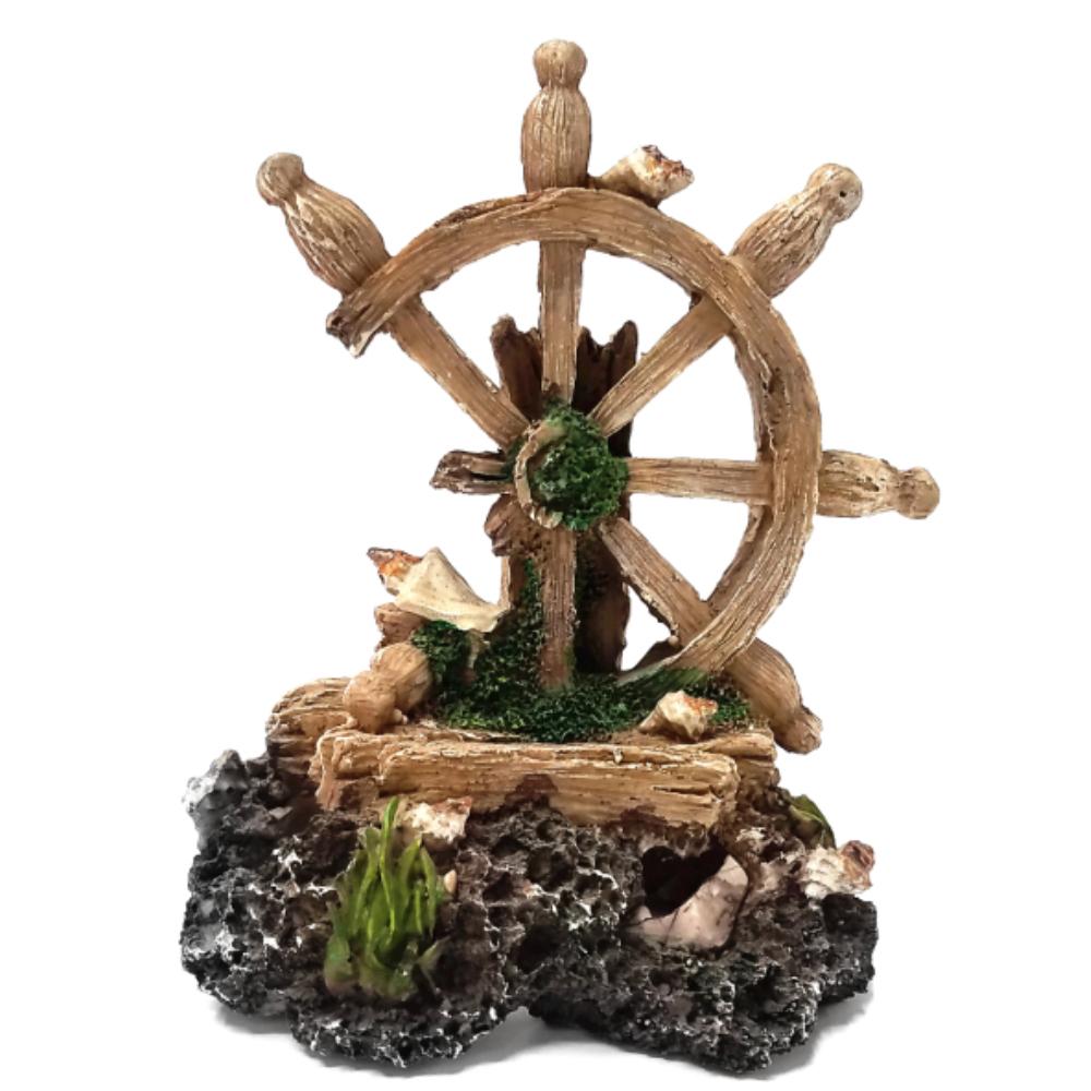 קישוט לאקווריום דגם מוקטן הגה רב חובל עשו מחומרים איכותיים, צביעה בצבע עמיד למים – תוספת נחמדה לעיצוב האקווריום. דקורציית רב חובל