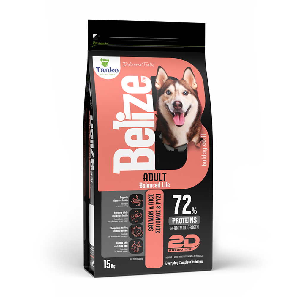 בליז אדולט סלמון ואורז לכלב בוגר כל הגזעים 15 ק”ג, פורמולה ייחודית מכילה 18% סלמון + בשר עוף מיובש, תמיכה בבריאות העיכול, במפרקים ובעצמות, ובמערכת החיסון