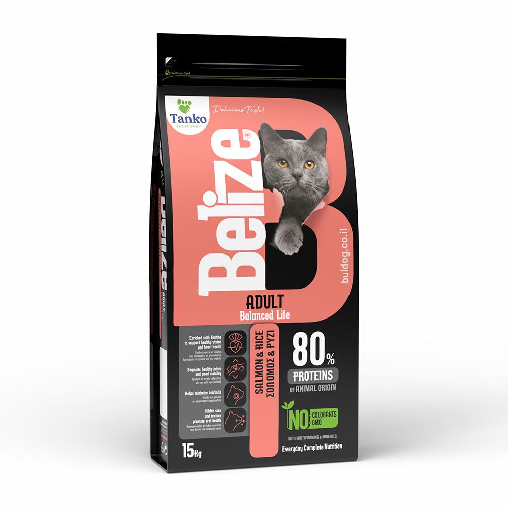 בליז סלמון ואורז לחתול בוגר כל הגזעים 15 ק”ג, פורמולה ייחודית מכילה 26% סלמון. תמיכה בעיכול בריא, בפרווה מבריקה ובמערכת החיסון.