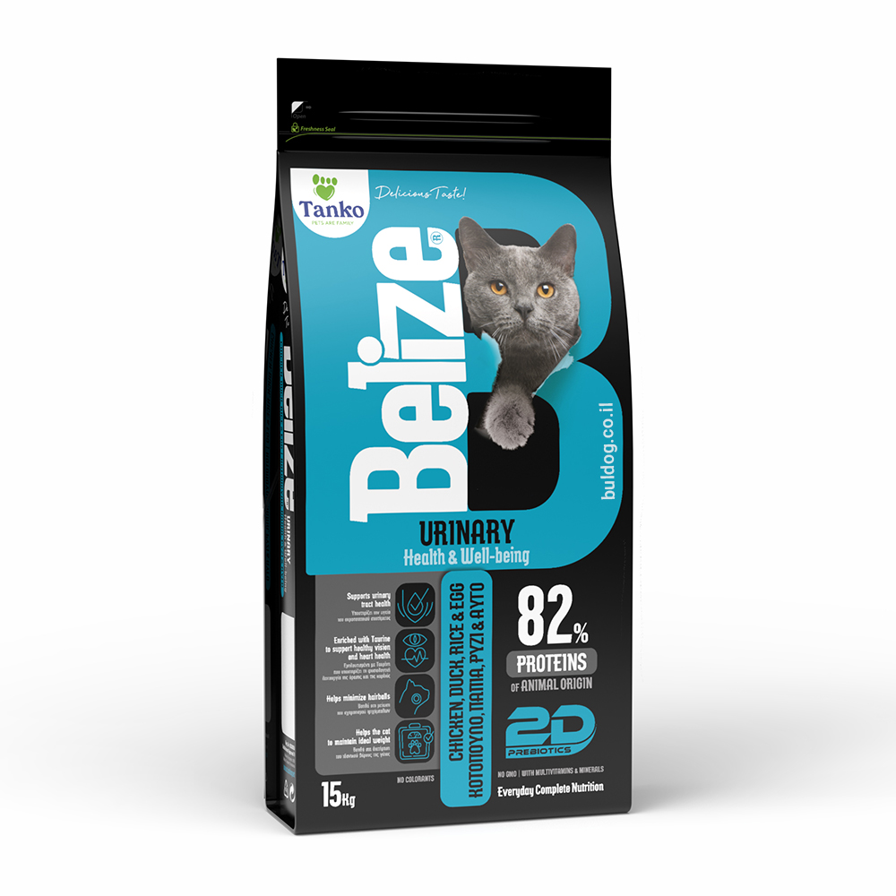 בליז יורינרי עוף, ברווז ואורז לחתול בוגר כל הגזעים 15 ק”ג, פורמולה ייחודית מכילה 15% עוף ו-5% ברווז. תמיכה בבריאות מערכת השתן, בעיכול תקין ובמערכת החיסון.