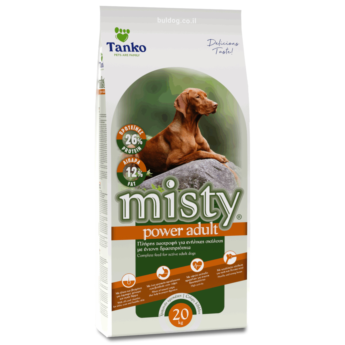 מיסטי פאואר אדולט לכלב בוגר כל הגזעים 20 ק”ג, פורמולה עשירה בחלבון ושומן, מתאימה לכלבים פעילים במיוחד, תומכת בפרווה מבריקה, עור בריא, עצמות חזקות ומערכת עיכול תקינה.