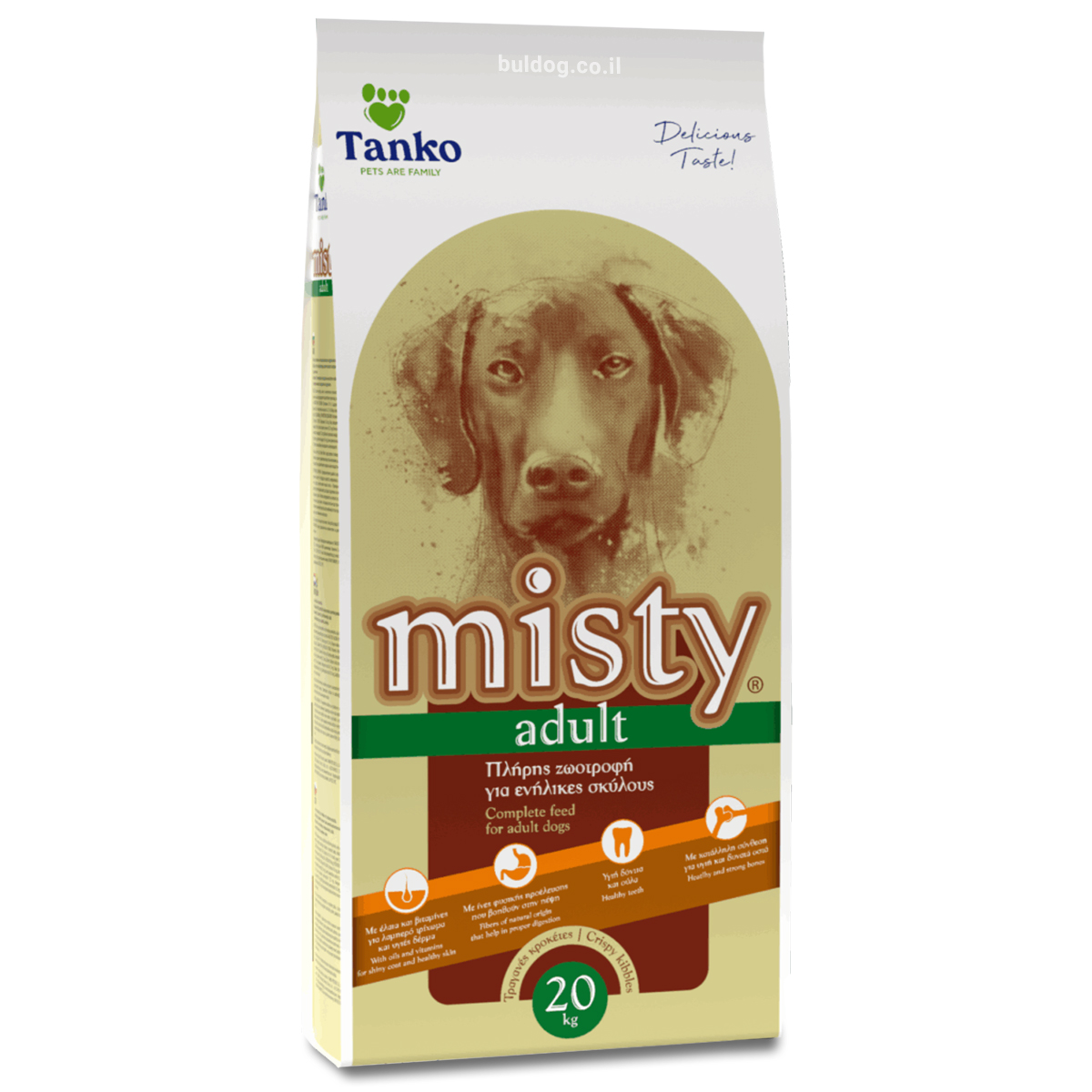מיסטי אדולט לכלב בוגר כל הגזעים 20 ק”ג, פורמולה מאוזנת מבוססת על חלבון מן החי, תומכת בעור בריא, בפרווה מבריקה, בשיניים ובעצמות חזקות ובמערכת החיסון.