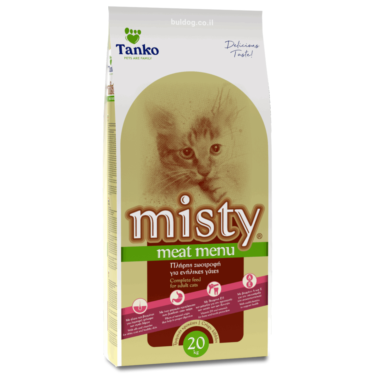 מיסטי איזי בוגר לחתולים 20 ק”ג, פורמולה מאוזנת המבוססת על חלבון מן החי, תומכת בפרווה מבריקה, עור בריא, תפקוד ראייה תקין ומערכת עיכול בריאה.