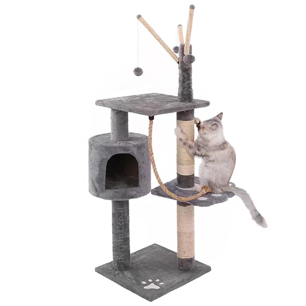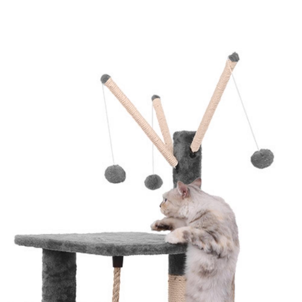 מתקן גירוד לחתול RN0120 – בית, משטחי רביצה וכדורים תלויים – 129 סמ